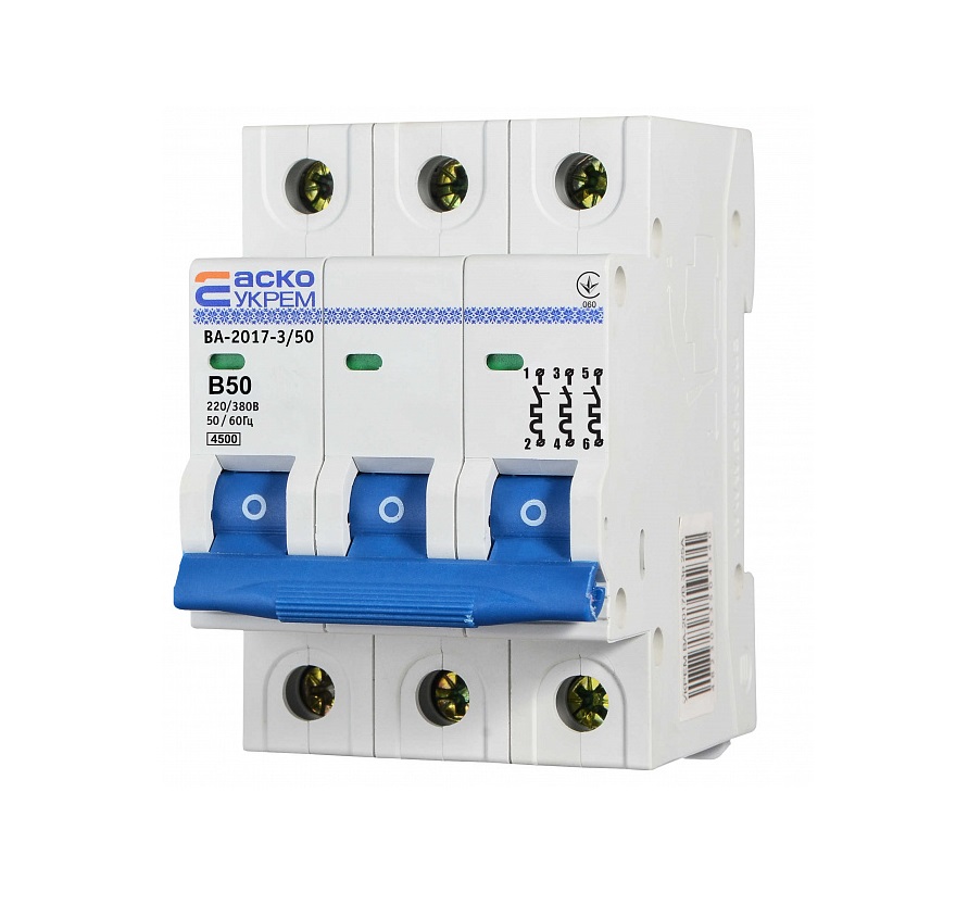 Характеристики: Автоматичний вимикач Аско-Укрем ВА-2017/B 3р 4.5kA 50А