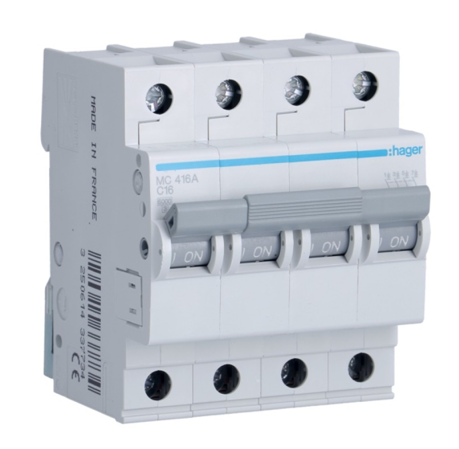Характеристики: Автоматичний вимикач Hager MCN406 C 4P 6кА 6A-25A