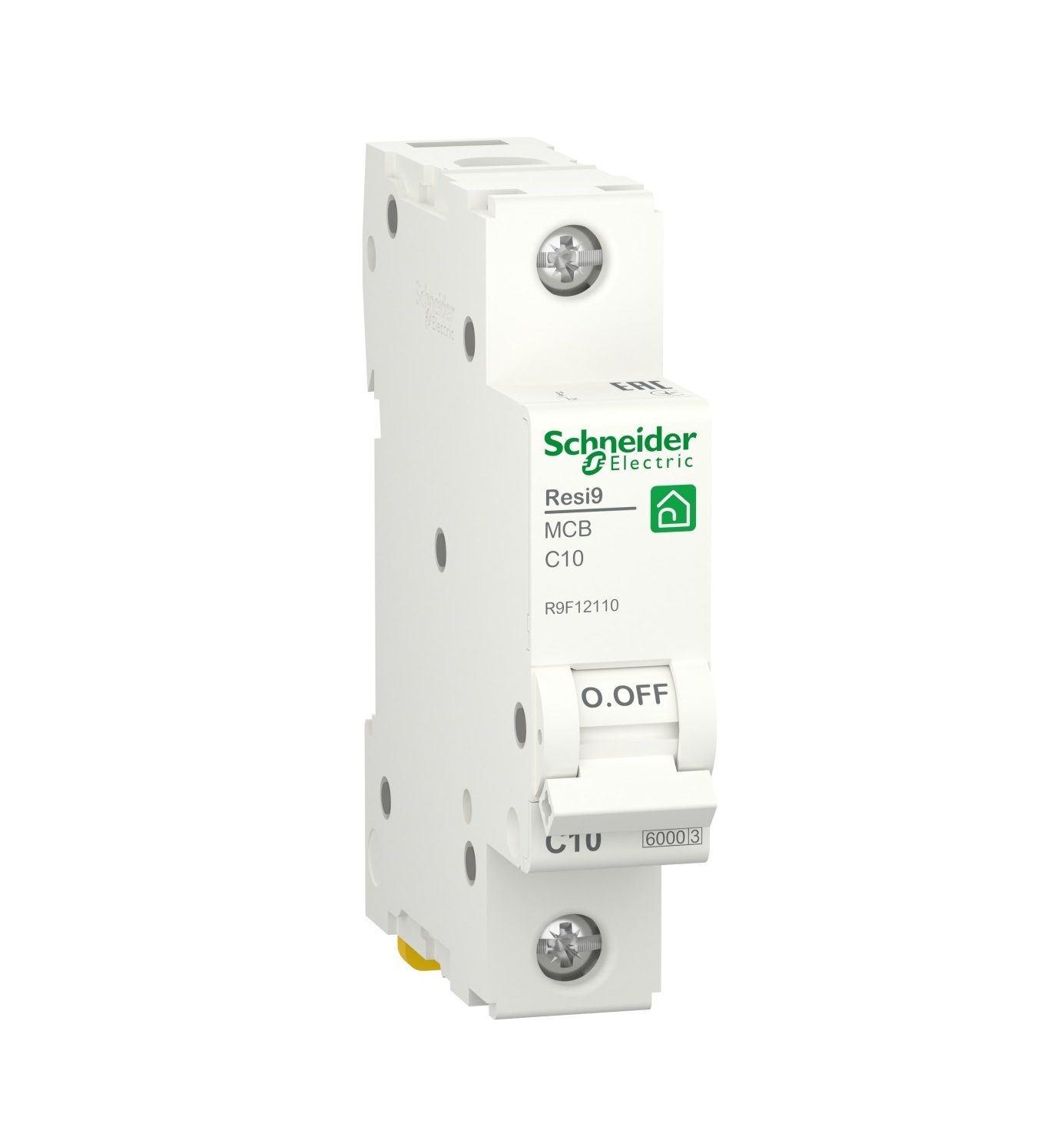 Мініатюрний автоматичний вимикач Resi9. Це 1-полюсний вимикач, з відповідним номінальним струмом та кривою відключення В. Номінальна відключаюча здатність становить до 6000 А при напрузі 230 В АС відповідно до стандарту EN/МЕК 60898-1.