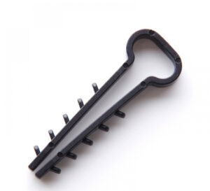 Нейлоновий дюбель типу «ялинка» – це спеціальний кріпильний елемент, призначений для швидкого та надійного закріплення плоских кабелів (наприклад, телефонних, телевізійних або інтернет-кабелів) на різних поверхнях.