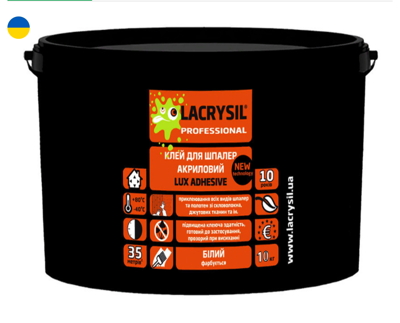 “LUX ADHESIVE” ТМ Lacrysil – це професійний клей для шпалер, призначений для приклеювання скловолокнистих шпалер і полотен, всіх видів важких шпалер, шпалер під фарбування, шпалер з текстилю та вінілу, шпалер на флізеліновій і поліестеровій основі, важких з тисненням, структурних, тафтінгових шпалер, джутових тканин в сухих приміщеннях на бетонні, пінобетонні, оштукатурені, зашпатльовані, гіпсокартонні і пофарбовані поверхні.