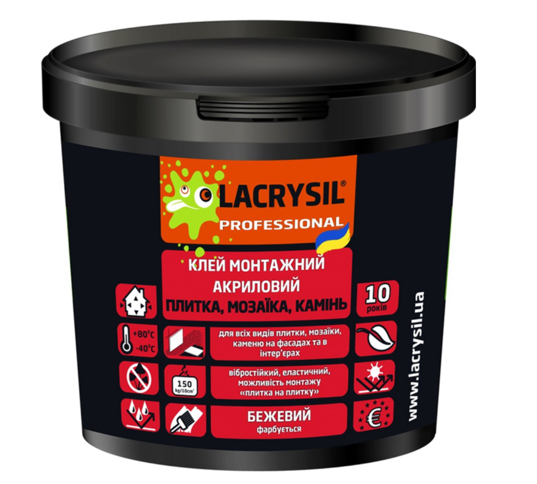 ДЛЯ ПЛИТКИ, МОЗАЇКИ ТА КАМЕНЮ ТМ Lacrysil – це високоякісний водно-дисперсійний акриловий клей, призначений для облицювання керамічною, скляною, фаянсової плиткою, каменем, мозаїкою всіх типів і ін. Клей готовий до застосування і є екологічно чистим продуктом. Ідеально підходить для маленького формату плитки та каменю. Матеріал вібростійкий і еластичний. Витримує великі навантаження і забезпечує довговічність склеювання. Підходить для підлог з підігрівом та точкового приклеювання ізоляційних матеріалів: пінополістиролу, пінополіуретану, мінеральної вати, скловати, оргалита, звукопоглинальних панелей на стелю і стіни з традиційних матеріалів і плит на основі дерева.