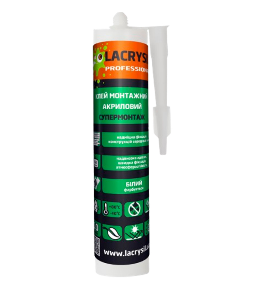 Клей монтажний акриловий “Супер монтаж” від Lacrysil — це універсальний будівельний клей, призначений для швидкого та надійного приклеювання широкого спектра матеріалів як всередині, так і ззовні приміщень.