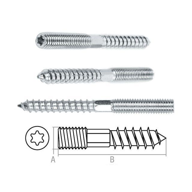 З одного боку шурупна різьба для дерева, с іншого метрична, шестигранник між метричною та шурупною різьбою для вкручування. З однієї сторони використовують пластиковий дюбель відповідного діаметру або дерево, ​з іншого боку метричне кріплення (наприклад трубні хомути).